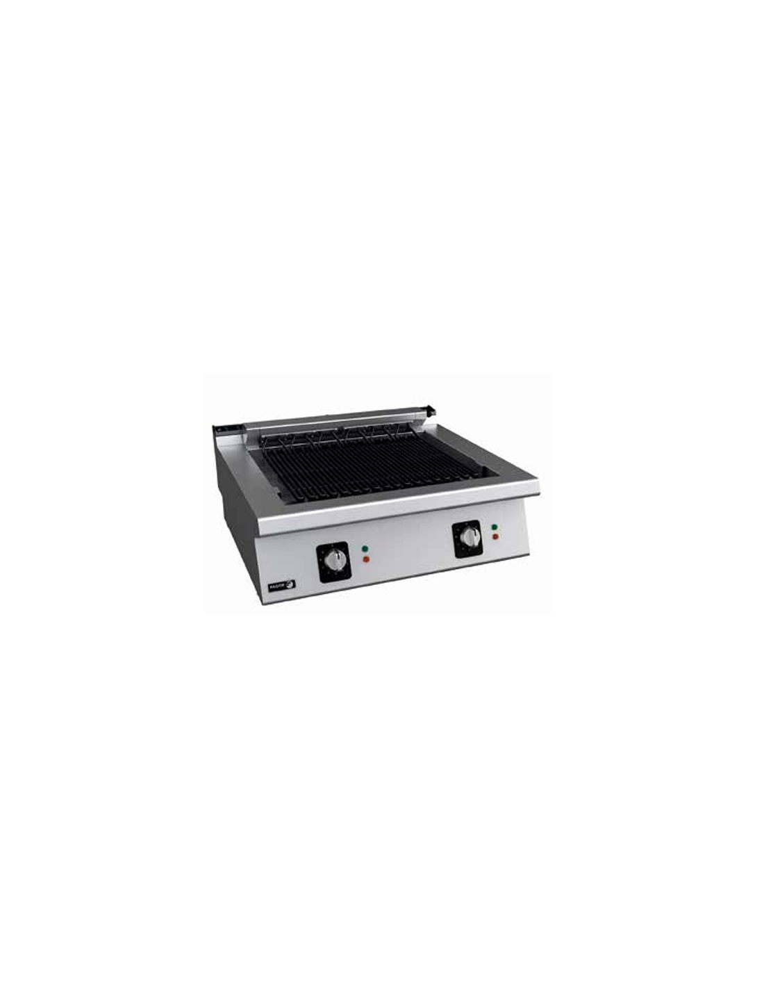 MODELOS A GAS DE SOBREMESA - Grupos de dos quemadores tubulares de alta eficiencia, (un grupo de dos quemadores para modelos de medio módulo, dos grupos para modelos de un módulo).- Control independiente para cada grupo de quemadores mediante válvula de seguridad con termopar.- Encendido de los quemadores mediante piezoeléctrico.- Los quemadores calientan las piedras cerámicas que se encuentran sobre una rejilla soporte, para que estas a su vez calienten el alimento situado en la parrilla.