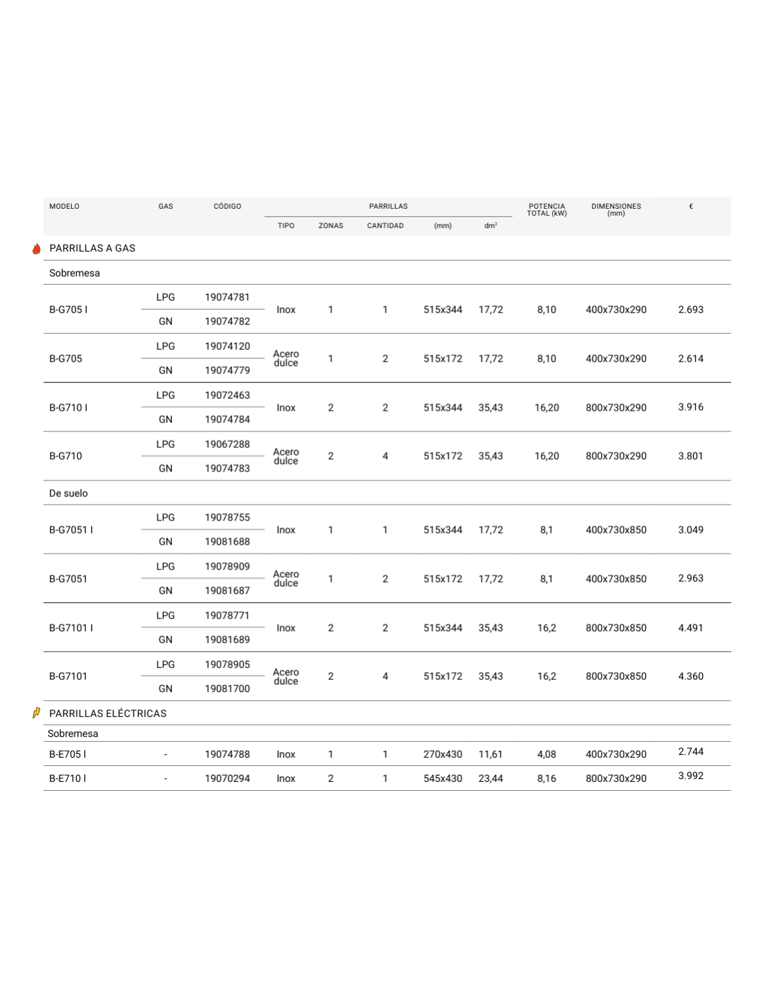 MODELOS A GAS DE SUELO- Grupos de tres quemadores tubulares de alta eficiencia, con deflector radiante (un grupo de tres quemadores para modelos de medio módulo, dos grupos para modelos de un módulo).- Control independiente para cada grupo de quemadores mediante válvula de seguridad con termopar.- Encendido de los quemadores mediante tren de chispas electrónico. Disponen de tubo de acceso para encendido manual.- Los cajones recoge-grasas ofrecen la posibilidad de introducir agua en ellos, y gracias a la irradiación de calor de los quemadores a gas o de las resistencias eléctricas se genera un vapor de baja intensidad, realizándose el asado en atmósfera de vapor.